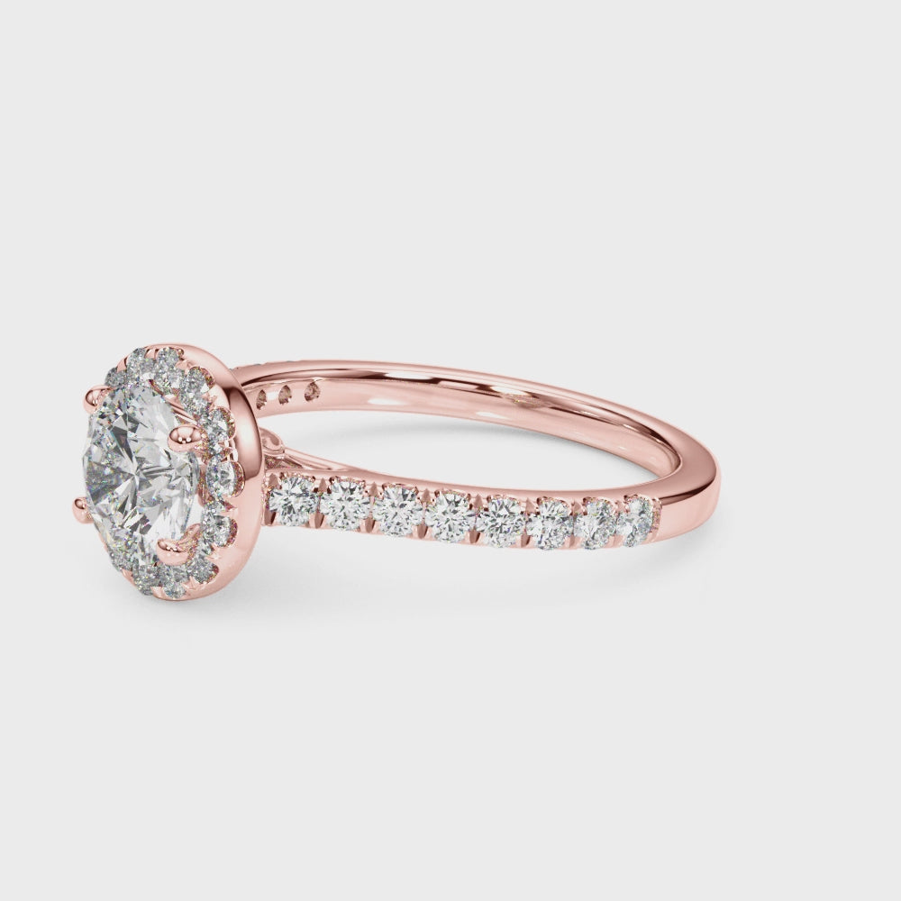 A certified round brilliant cut diamond shines at the heart of this exquisite piece, embraced by a scintillating halo of perfectly matched diamonds that enhances every sparkle. The rose-gold band, gently adorned with diamond accents, brings a touch of tenderness and passion to this timeless design — a ring that feels as radiant as the love it represents.